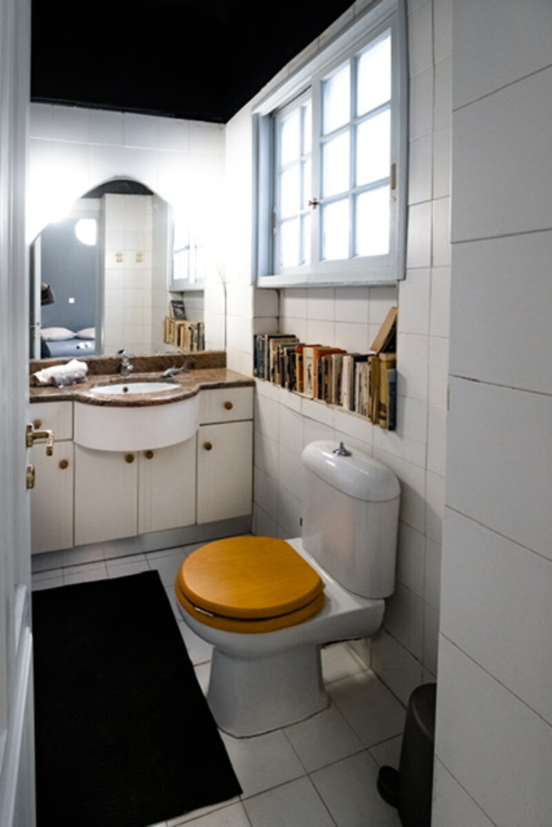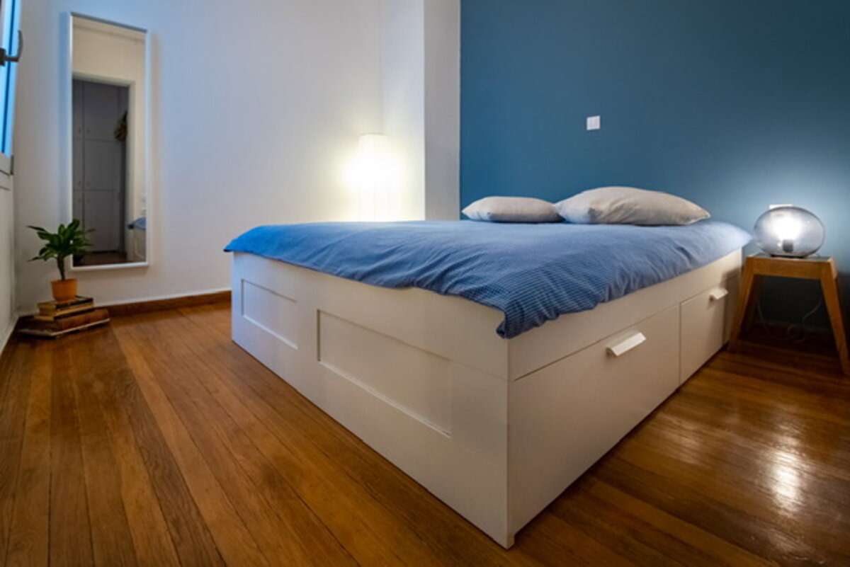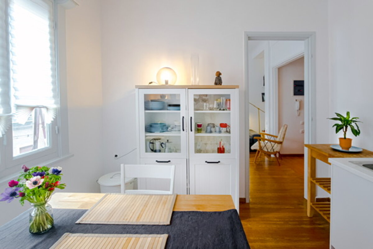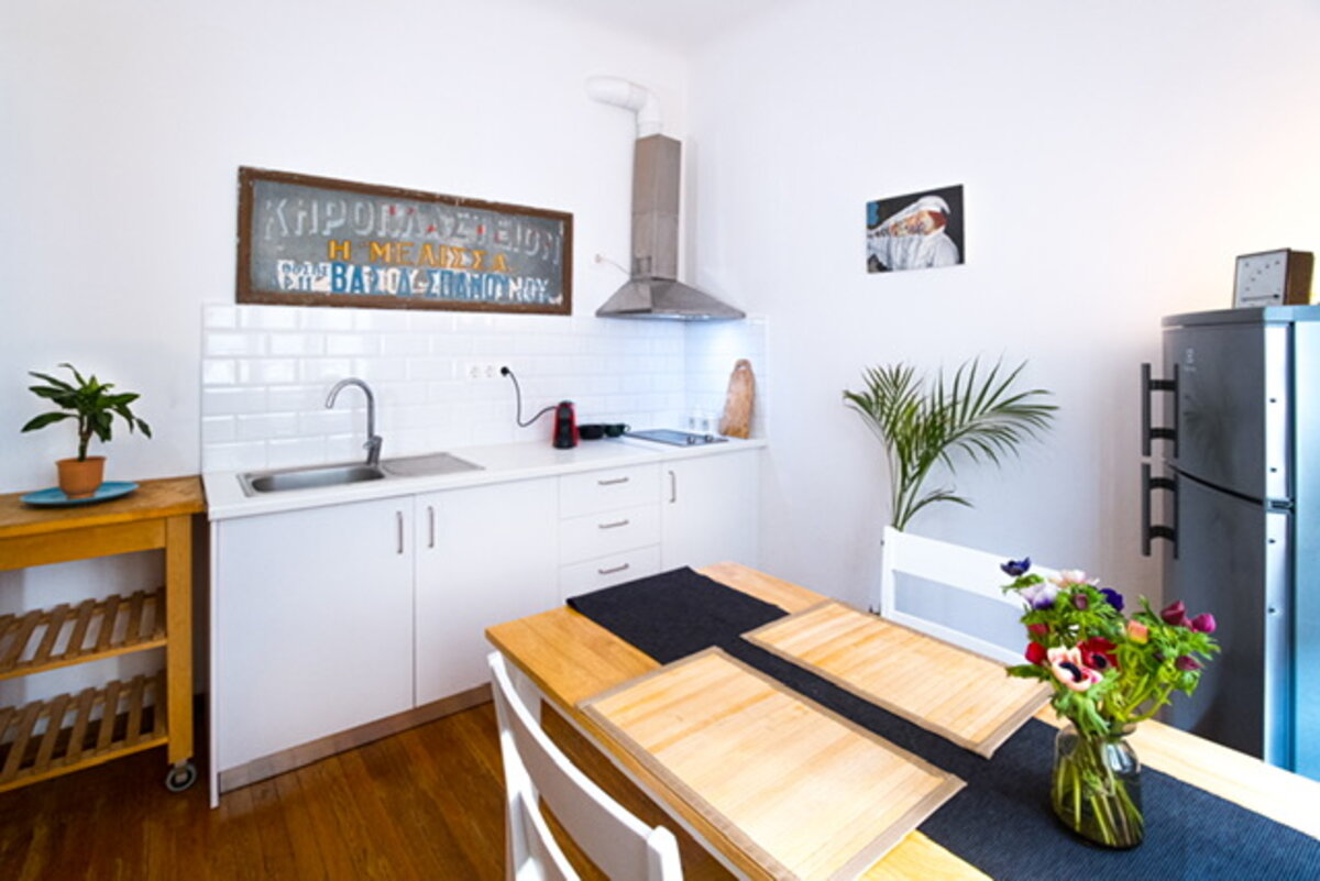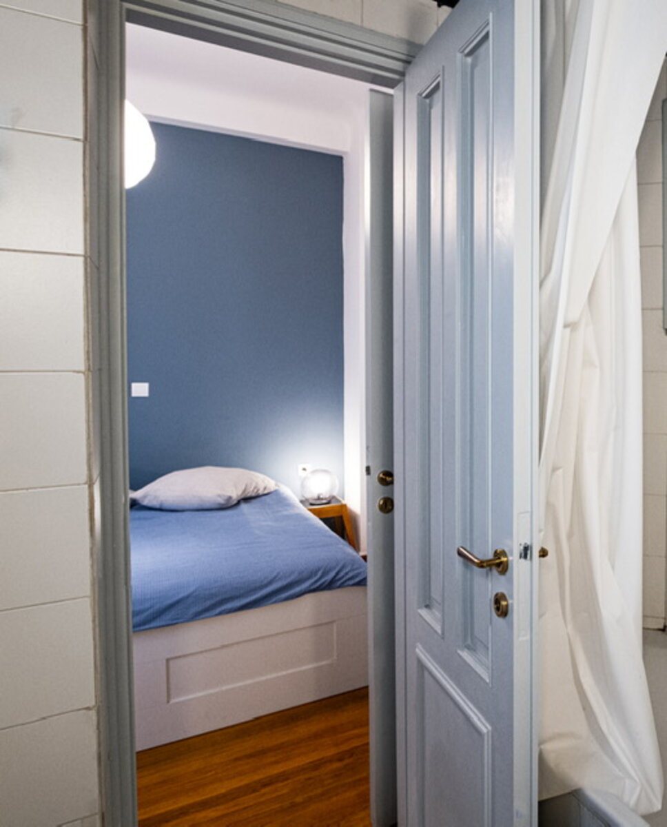 Ανακαίνιση μικρού διαμερίσματος σε τριώροφη οικία του 1910 στο Κολωνάκι. Μικρές παρεμβάσεις, όπως το βάψιμο των τοίχων στο ταβάνι του μπάνιου και στην πλάτη του κρεβατιού, μια απλή λευκή κουζίνα, ένα κρεμαστό φωτιστικό δίπλα στον καναπέ.