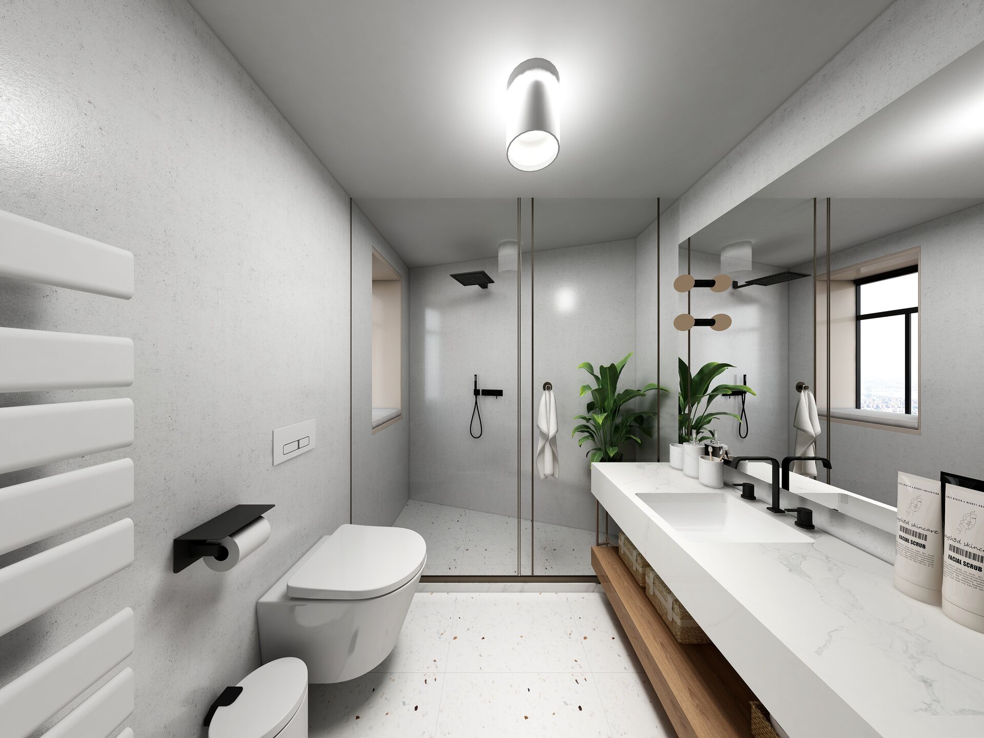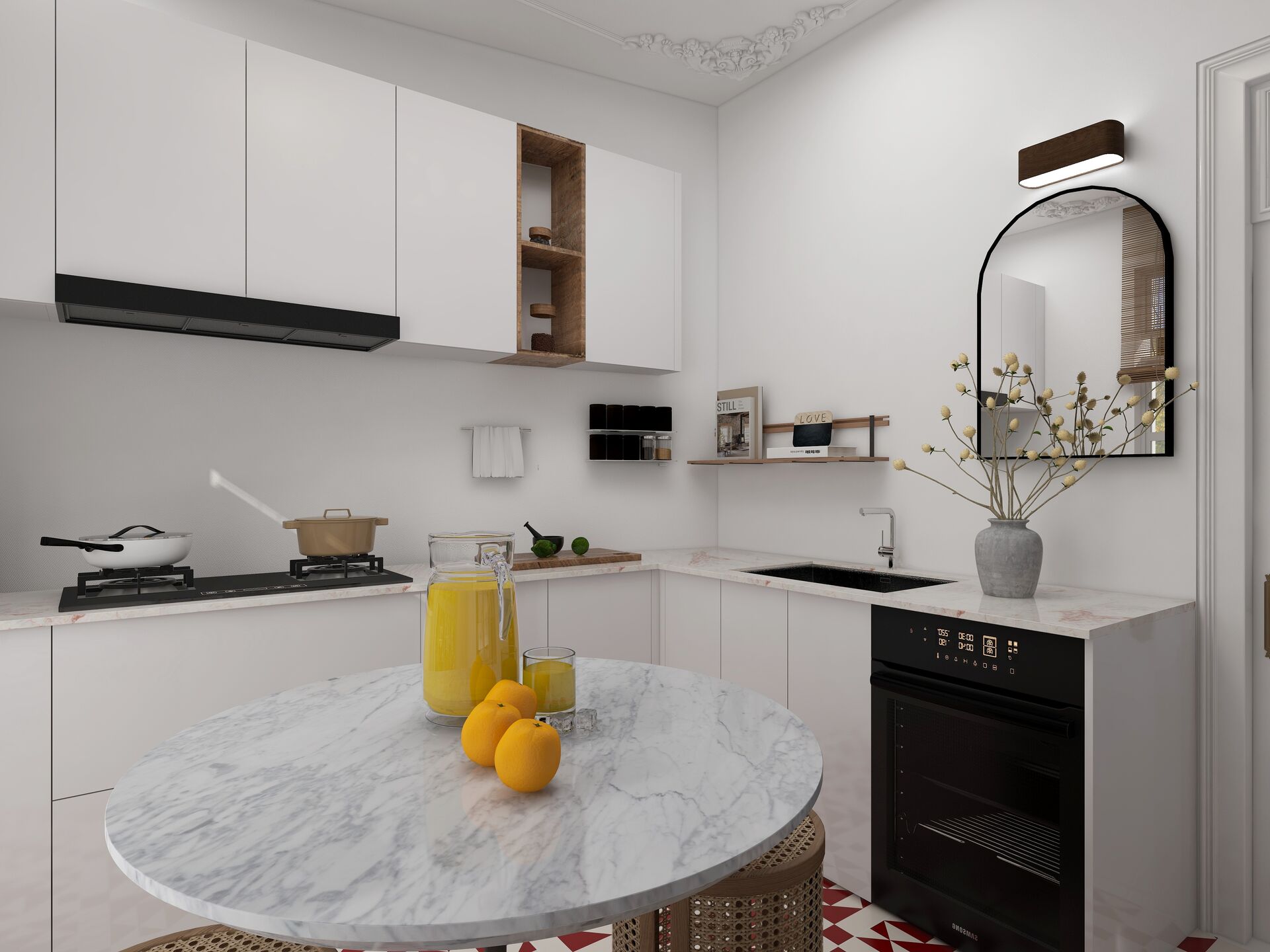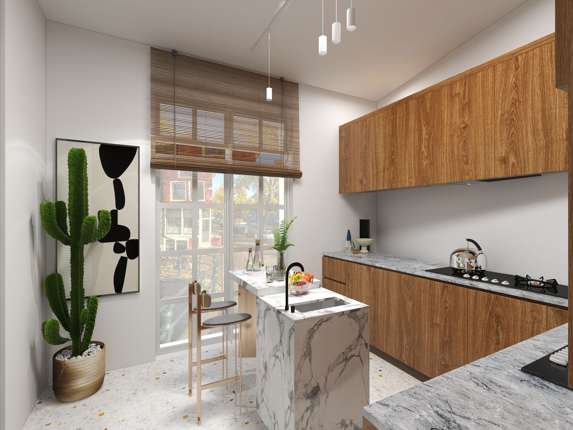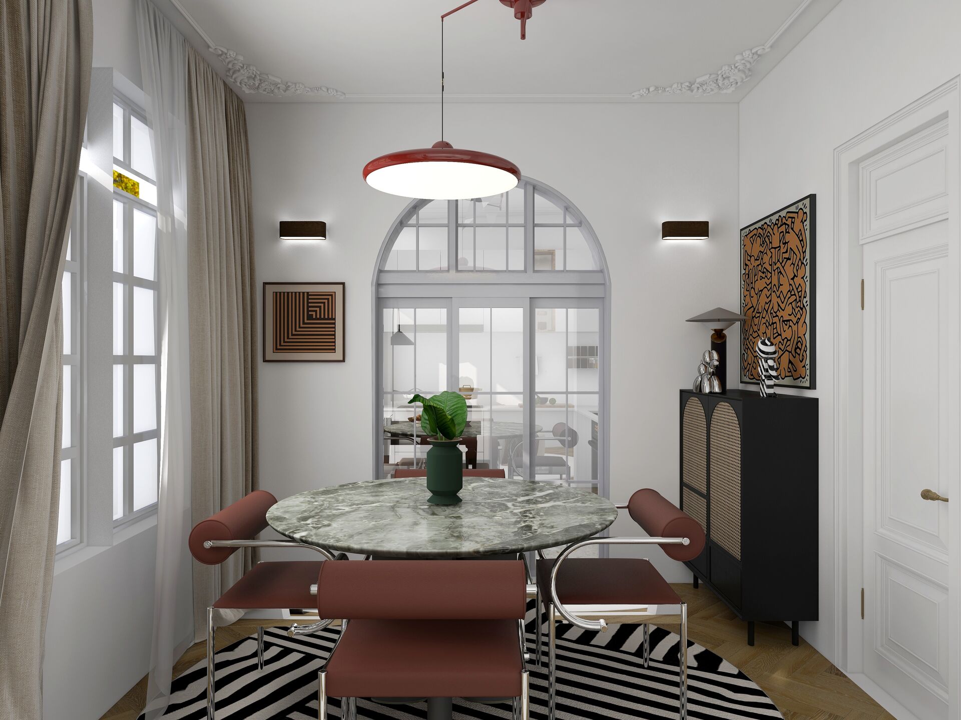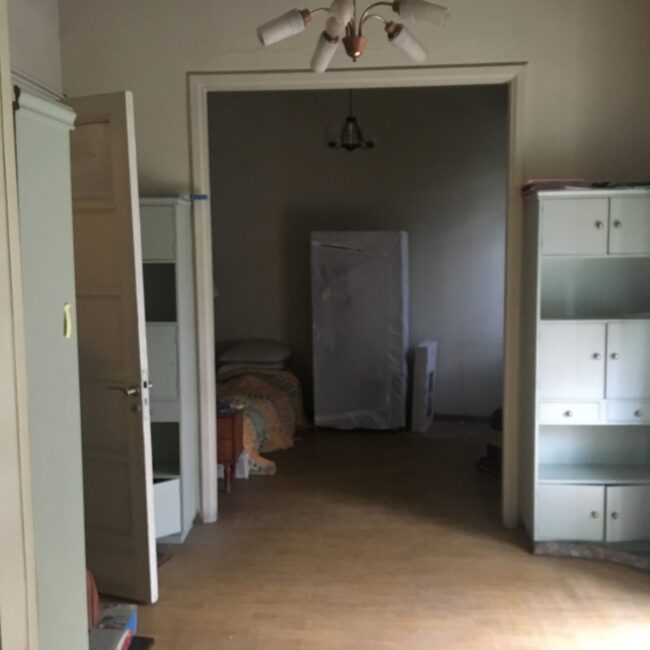 Βασική αλλαγή, η κουζίνα του δεύτερου ορόφου μεταφέρθηκε στο ένα από τα τρία δωμάτια του τρίπτυχου 2 σαλόνια-τραπεζαρία και ο χώρος αυτός διαμορφώθηκε σε δεύτερο υπνοδωμάτιο.